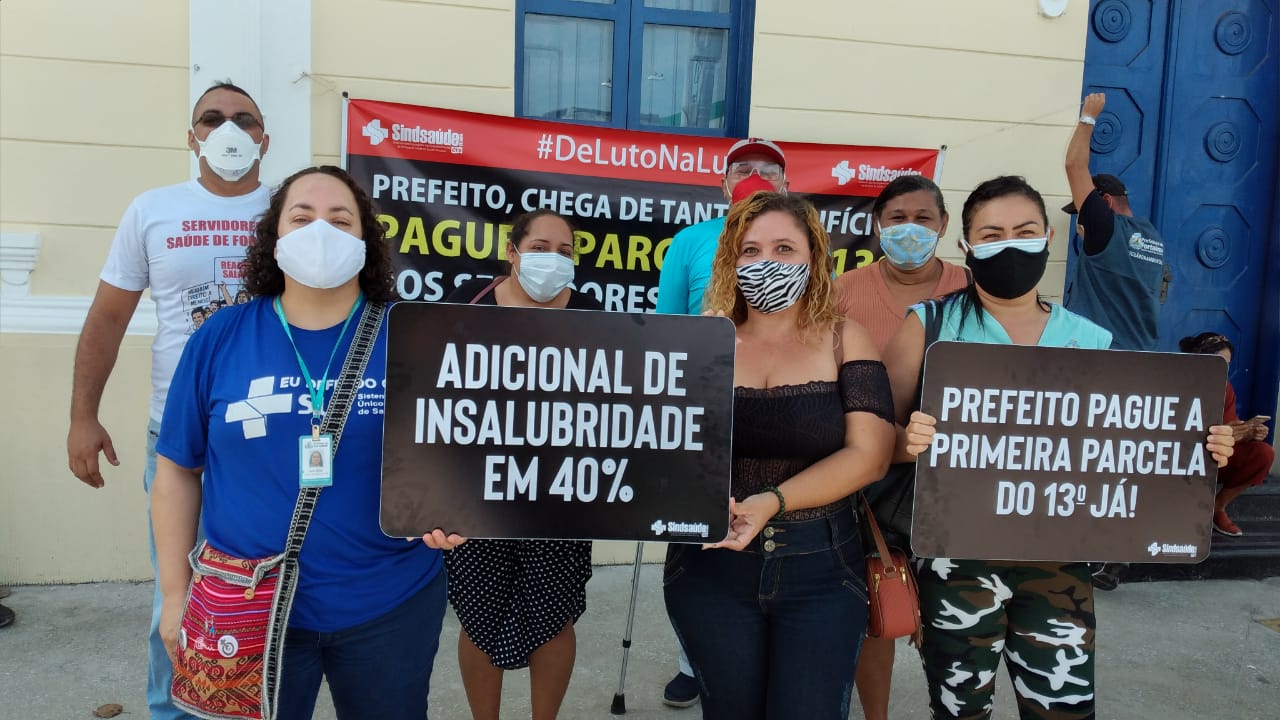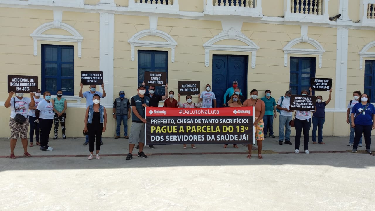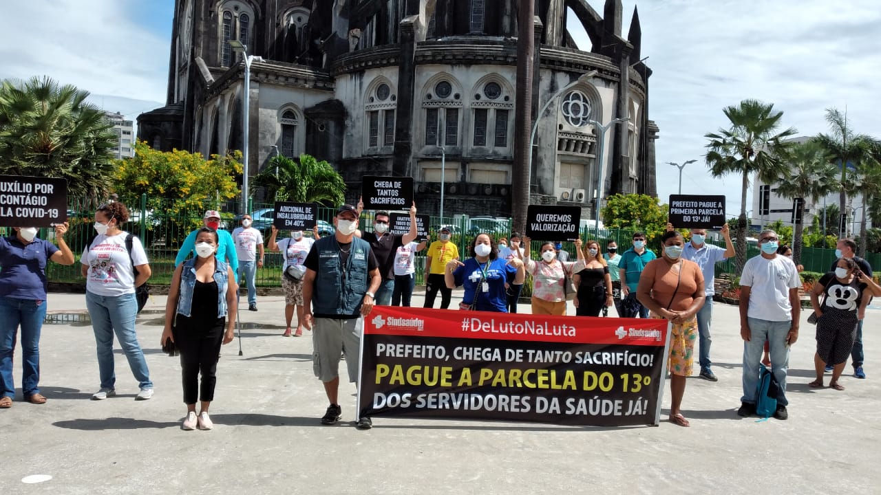 A faixa destacava a reivindicação mais urgente dos servidores da saúde de Fortaleza:a antecipação da primeira parcela do 13º dos servidores da saúde de Fortaleza, suspensa pela prefeitura. Com máscaras de proteção, dirigentes do Sindsaúde e servidores municipais da saúde se posicionaram en frente ao Paço Municipal, sede da prefeitura, pedindo a valorização desta categoria, que vem sofrendo com o luto diário de colegas, devido à alta letalidade do novo Coronavírus.