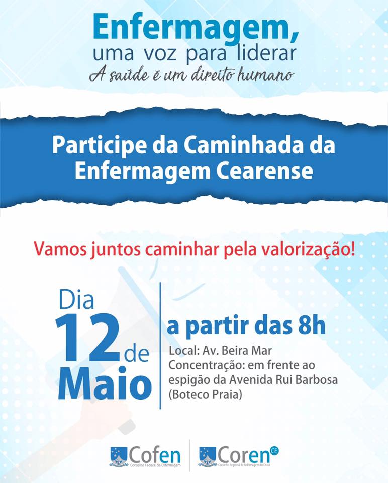 No próximo sábado (12/05), data em que é celebrado o Dia Mundial do Enfermeiro, a Avenida Beira Mar, em Fortaleza, receberá milhares de profissionais e estudantes de Enfermagem durante a IV Caminhada da Enfermagem Cearense. O evento organizado pelo Conselho Regional de Enfermagem do Ceará (Coren-CE) integra a programação do Mês da Enfermagem e terá concentração a partir das 8h, em frente ao espigão da Av. Rui Barbosa.