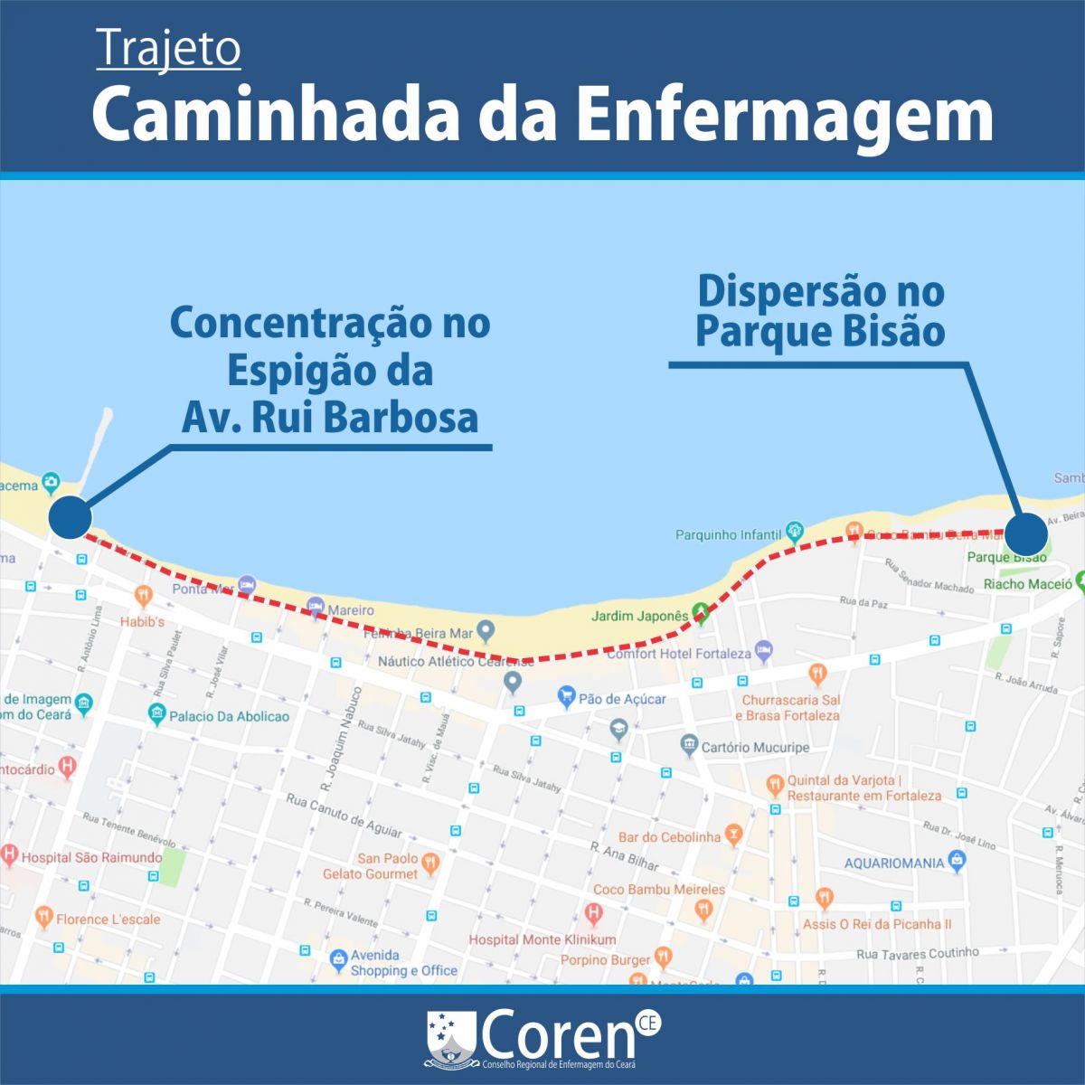 As camisetas com o tema “Enfermagem, uma voz para liderar – A saúde é um direito humano” serão entregues na concentração. A IV Caminhada da Enfermagem Cearense irá percorrer a Av. Beira Mar até o Parque Bisão, nas imediações da estátua de Iracema do Mucuripe.