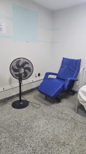 No setor de Hemodinâmica, as condições são especialmente preocupantes: o banheiro feminino apresenta risco de cortes devido à falta de cerâmica, o espaço de repouso conta com apenas três camas para todos os profissionais, e o ambiente é abafado e insuficiente. Além disso, os trabalhadores são obrigados a compartilhar a copa com os pacientes, sem um espaço adequado para suas refeições.