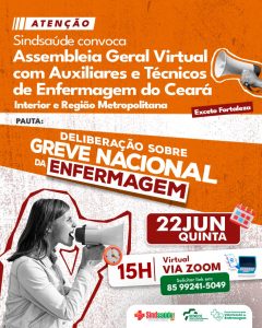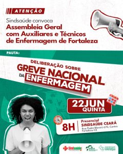 A participação dos profissionais da enfermagem na assembleia é de fundamental importância nessa luta que já dura mais de 30 anos. A assembleia irá ocorrer no dia 22 de junho em dois momentos. Às 8h da manhã, será presencial na sede do Sindsaúde Ceará, localizado na Rua Padre Mororó, 670, com os profissionais de Fortaleza.